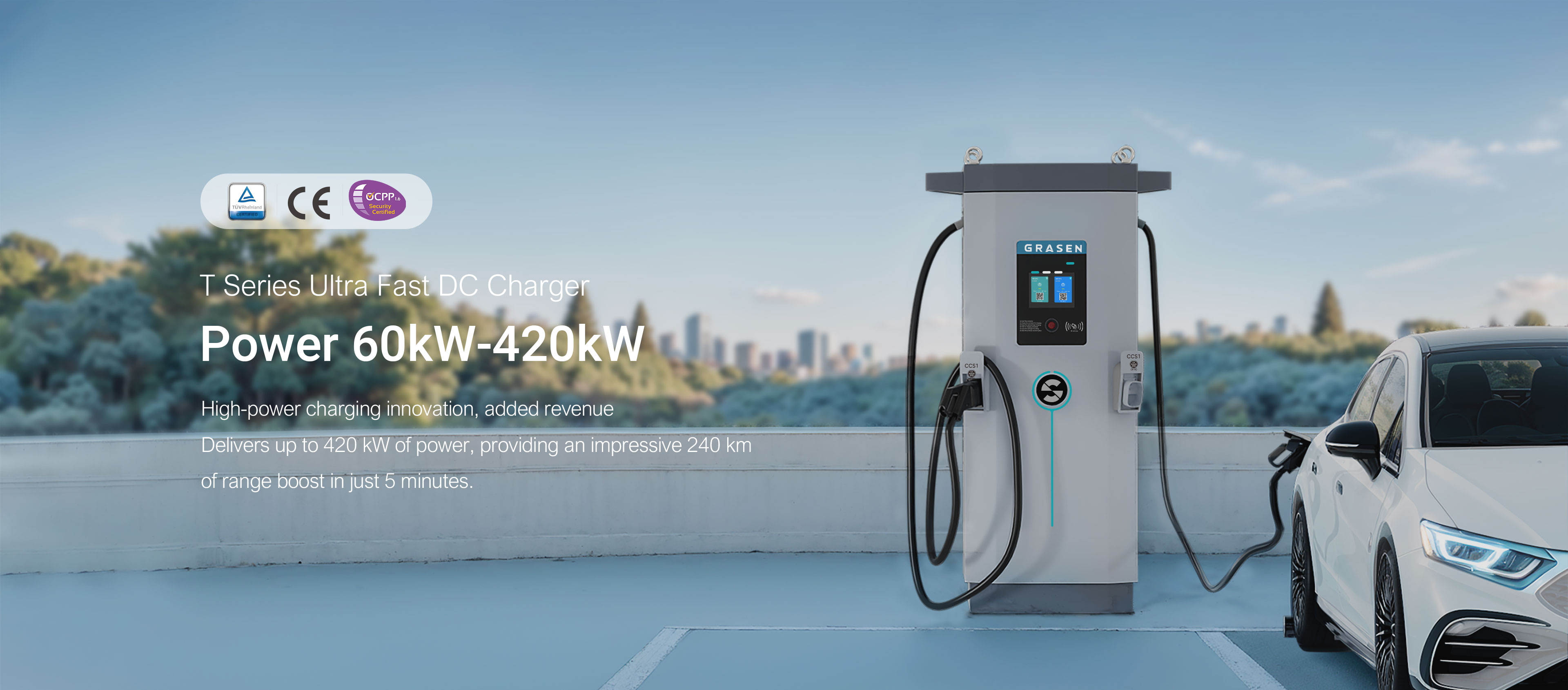 Power up to 420kW, delivering 240 km of range in just 5 minutes, works with all EVs